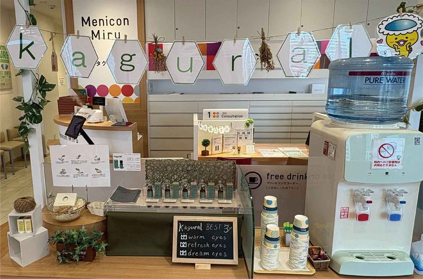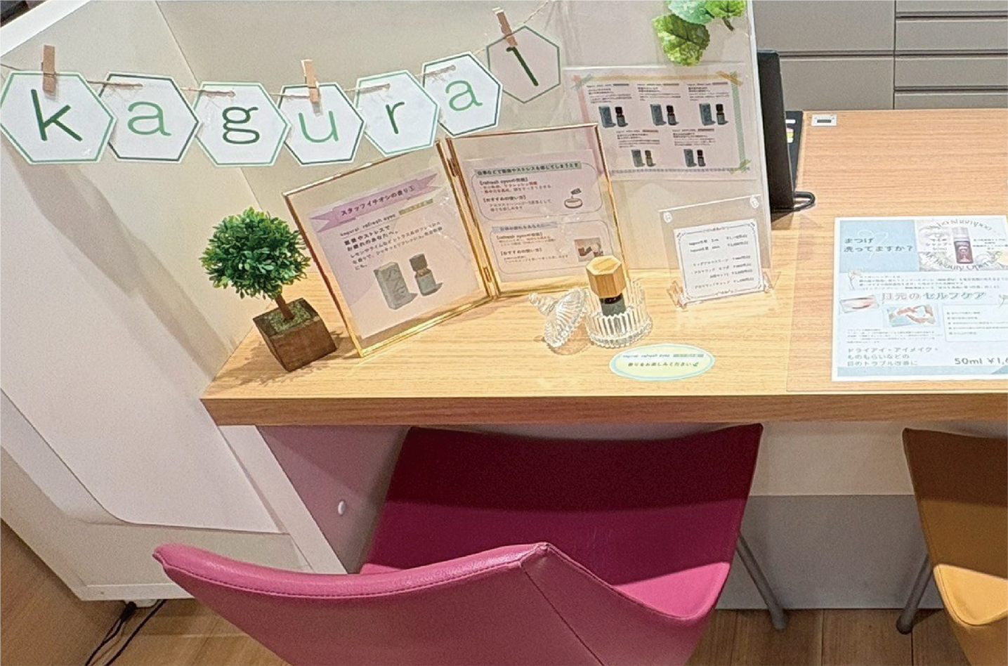 100%の天然精油という質の高さをアピールする為、自然豊かな緑多めのディスプレイに店舗のイチオシの香りや人気ランキングも掲示し、少しでも多くの方に興味を持っていただけるよう工夫しています。