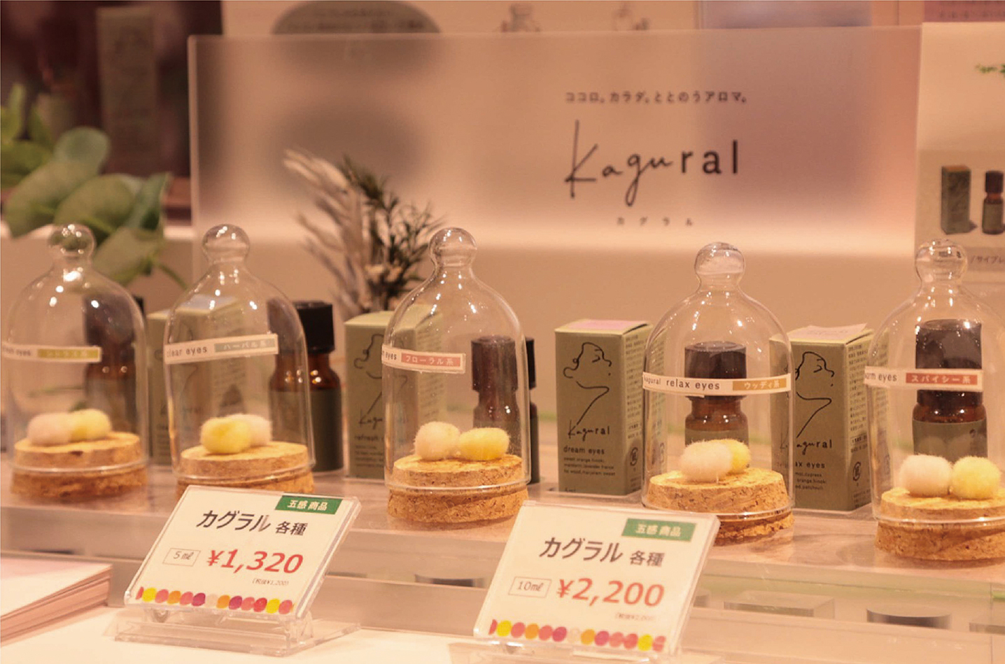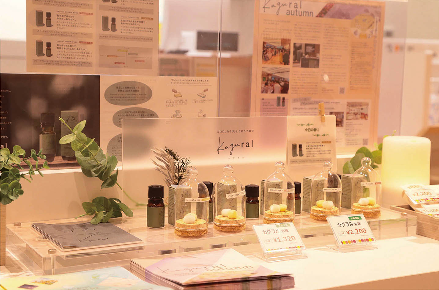 kaguralのイメージに合うように、シンプルでナチュラルな雰囲気に緑をプラスしたディスプレイを心がけています。また、すぐに香りを楽しんでいただけるガラスボトルを使用し、お試しいただきやすくしています。