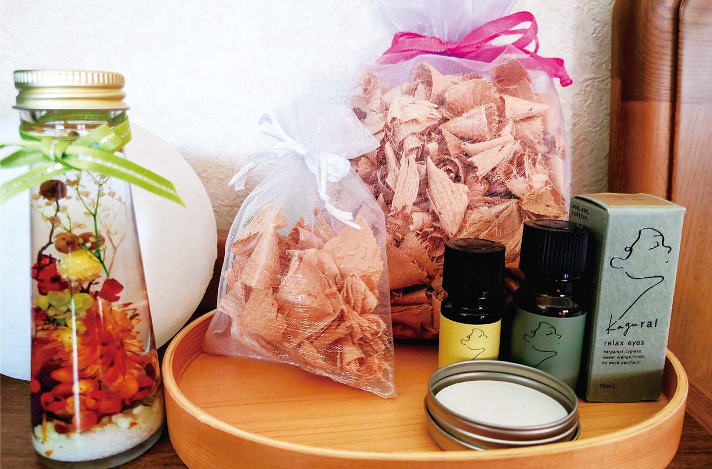 ベッドサイドに青森ヒバを削ったもの(カンナ屑)を置いているのですが、ウッディ系のrelax eyesがマッチしてお気に入りです。また、エッグアロマストーンに違う香りを垂らすこともありますが、他の香りと混ざってもケンカせず使用できるのもkaguralの良い点のひとつです。
